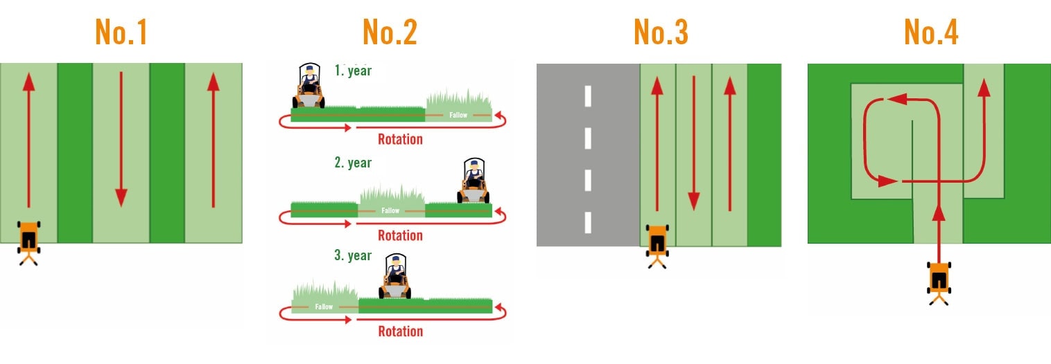 - Alternatívne môže byť použitý pruhový spôsob kosenia, ktorý usmerňuje živočíchy von a zároveň zachováva útočiská (pozri obrázok 3).
